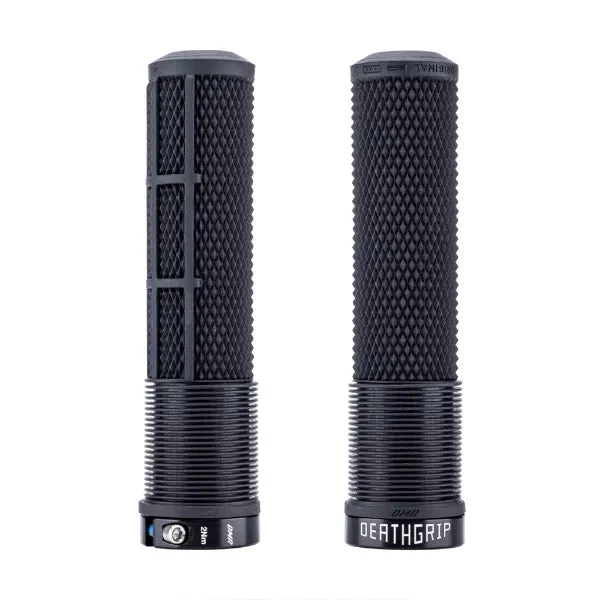 The DMR Deathgrip2 features the grip pattern and layout that inspired a whole generation of mountain bike grips – it starts with a soft mushroom section for comfort in the thumb and forefinger area, preventing blisters in a soft-tissue zone. Next, the grip pattern features diamond knurl for grip in all conditions and all terrains – and the waffle layout underside holds your fingers in the perfect position for grip and control. A tapered core means the Deathgrip is firmly mounted onto your handlebars with ease and the use of just one lockring keeps things simple and tight. The krayton rubber grip compounds we use are soft and comfortable, yet durable and lightweight. Select thin or thick diameters, and with or without flanges – the choice is yours.